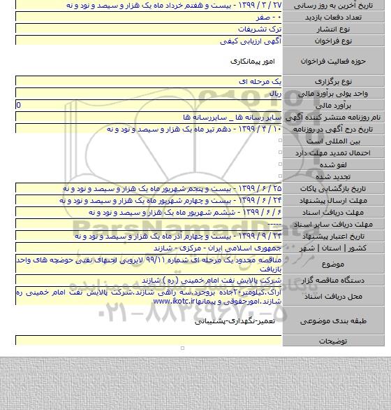 مناقصه, مناقصه محدود یک مرحله ای شماره ۹۹/۱۱ لایروبی لجنهای نفتی حوضچه های واحد بازیافت از کلیه افراد متخصص و شرکتها واجد شرایط دعوت به عمل میآید در مناقصه با کد خبرگزاری پارس نماد: 2502636 شرکت نمایند.