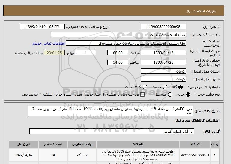 شرح کلی نیاز: خرید ECمتر قلمی تعداد 18 عدد، رطوبت سنج ودماسنج دیجیتال تعداد 19 عدد، PH متر قلمی جیبی تعداد7 عدد