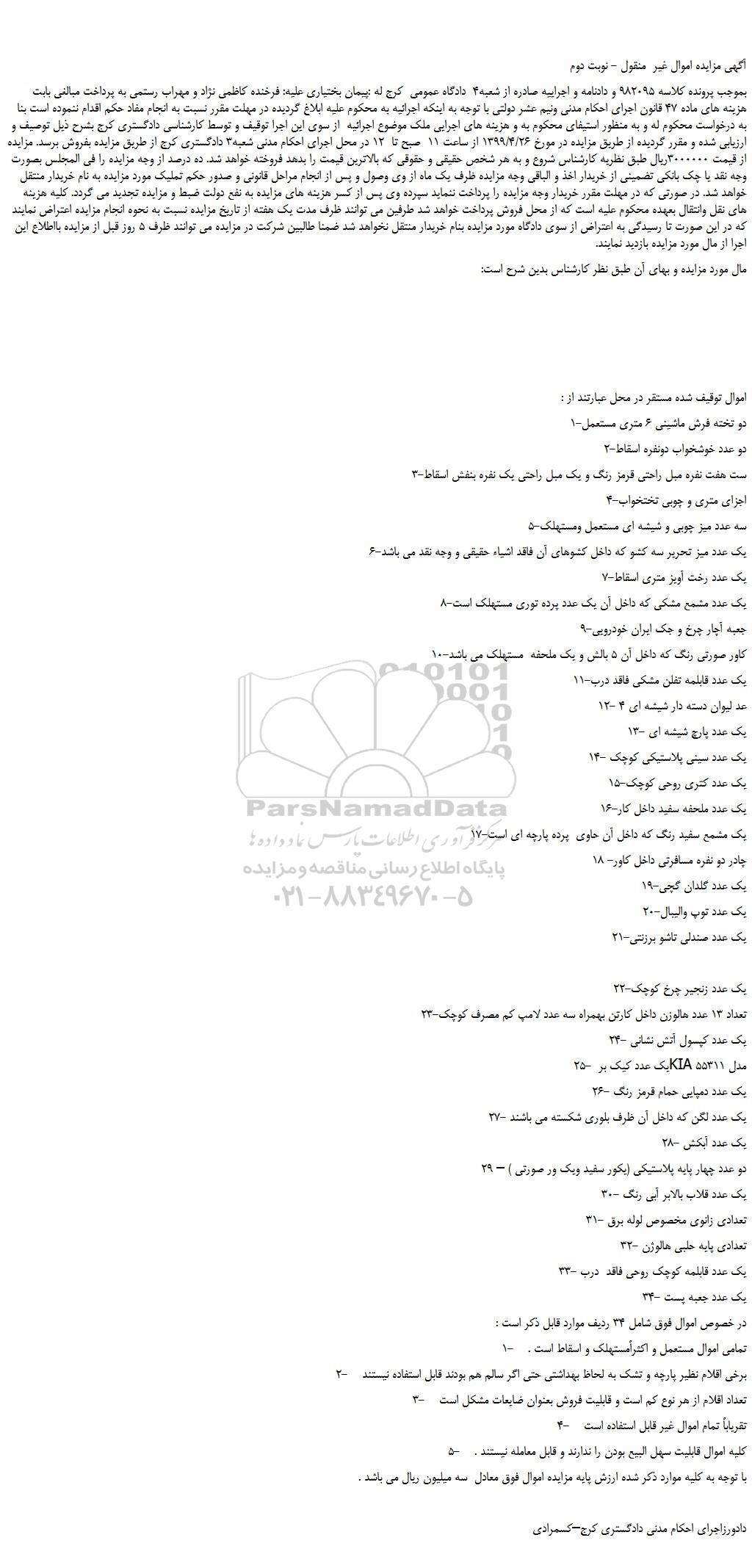 بموجب پرونده کلاسه 982095 و دادنامه و اجراییه صادره از شعبه4  دادگاه عمومی  کرج له :پیمان بختیاری علیه: فرخنده کاظمی نژاد و مهراب رستمی به پرداخت مبالغی بابت هزینه های ماده 47 قانون اجرای احکام مدنی ونیم عشر دولتی با توجه به اینکه اجرائیه به محکوم علیه ابلاغ گردیده در مهلت مقرر نسبت به انجام مفاد حکم اقدام ننموده است بنا به درخواست محکوم له و به منظور استیفای محکوم به و هزینه های اجرایی ملک موضوع اجرائیه  از سوی این اجرا توقیف و توسط کارشناسی دادگستری کرج بشرح ذیل توصیف و ارزیابی شده و مقرر گردیده از طریق مزایده در مورخ 1399/4/26 از ساعت 11  صبح تا  12 در محل اجرای احکام مدنی شعبه3 دادگستری کرج از طریق مزایده بفروش برسد. مزایده از قیمت 3000000ریال طبق نظریه کارشناس شروع و به هر شخص حقیقی و حقوقی که بالاترین قیمت را بدهد فروخته خواهد شد. ده درصد از وجه مزایده را فی المجلس بصورت وجه نقد یا چک بانکی تضمینی از خریدار اخذ و الباقی وجه مزایده ظرف یک ماه از وی وصول و پس از انجام مراحل قانونی و صدور حکم تملیک مورد مزایده به نام خریدار منتقل خواهد شد. در صورتی که در مهلت مقرر خریدار وجه مزایده را پرداخت ننماید سپرده وی پس از کسر هزینه های مزایده به نفع دولت ضبط و مزایده تجدید می گردد. کلیه هزینه های نقل وانتقال بعهده محکوم علیه است که از محل فروش پرداخت خواهد شد طرفین می توانند ظرف مدت یک هفته از تاریخ مزایده نسبت به نحوه انجام مزایده اعتراض نمایند که در این صورت تا رسیدگی به اعتراض از سوی دادگاه مورد مزایده بنام خریدار منتقل نخواهد شد ضمنا طالبین شرکت در مزایده می توانند ظرف 5 روز قبل از مزایده بااطلاع این اجرا از مال مورد مزایده بازدید نمایند.