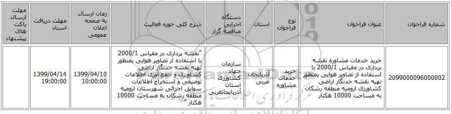 2099000096000002خرید خدمات مشاوره نقشه برداری در مقیاس 2000/1 با استفاده از تصاویر هوایی بمنظور تهیه نقشه حدنگار اراضی کشاورزی ارومیه منطقه رشکان به مساحت 10000 هکتارخرید خدمات مشاورهآذربایجان غربیسازمان جهاد کشاورزی استان آذربایجانغربی"نقشه برداری در مقیاس 2000/1 با استفاده از تصاویر هوایی بمنظور تهیه نقشه حدنگار اراضی کشاورزی و جمع آوری اطلاعات توصیفی و استخراج اطلاعات سوابق اجرائی شهرستان ارومیه منطقه رشکان به مساحت 10000 هکتار " 1399/04/10 10:00:001399/04/14 19:00:00