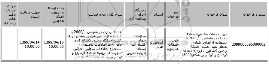 مناقصه، خرید خدمات مشاوره نقشه برداری در مقیاس 2000/1 با استفاده از تصاویر هوایی بمنظور تهیه نقشه حدنگار اراضی کشاورزی ارومیه منطقه قره باغ و قوشچی هکتار15000, خرید خدمات مشاوره نقشه برداری در مقیاس 2000/1 با استفاده از تصاویر هوایی بمنظور تهیه نقشه حدنگار اراضی کشاورزی ارومیه منطقه قره باغ و قوشچی هکتار15000