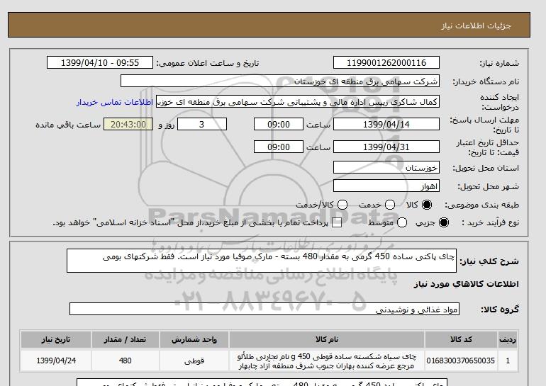 شرح کلی نیاز: چای پاکتی ساده 450 گرمی به مقدار 480 بسته - مارک صوفیا مورد نیاز است. فقط شرکتهای بومی