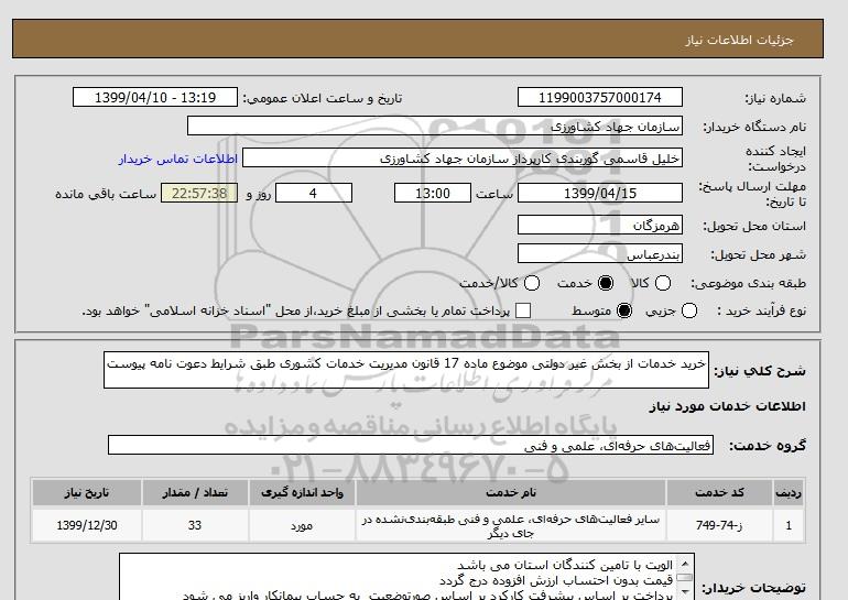 شرح کلی نیاز: خرید خدمات از بخش غیر دولتی موضوع ماده 17 قانون مدیریت خدمات کشوری طبق شرایط دعوت نامه پیوست