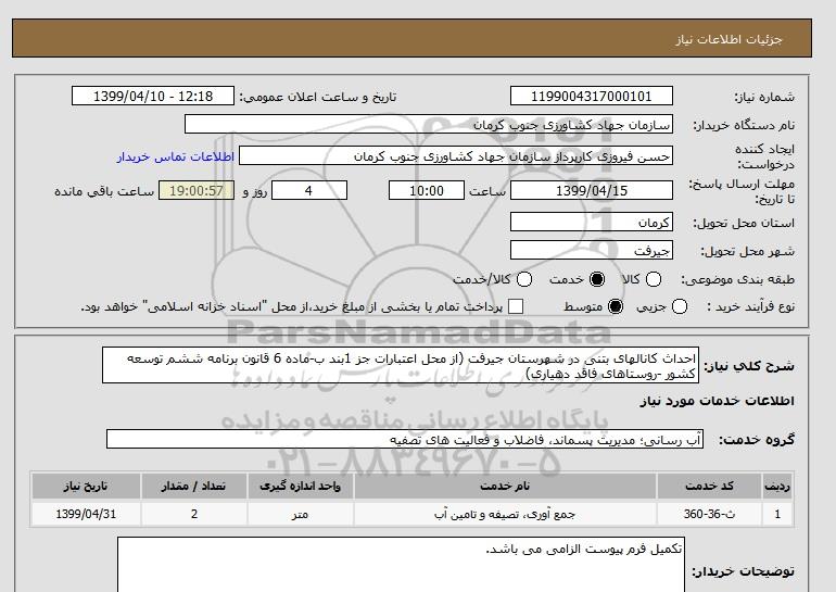 شرح کلی نیاز: احداث کانالهای بتنی در شهرستان جیرفت (از محل اعتبارات جز 1بند ب-ماده 6 قانون برنامه ششم توسعه کشور -روستاهای فاقد دهیاری)