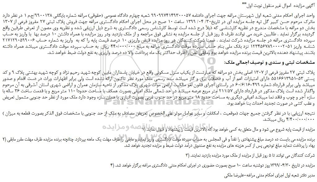 مزایده فروش پلاک ثبتی 27 مفروز فرعی از 1307 , مزایده، مزایده فروش پلاک ثبتی 27 مفروز فرعی از 1307