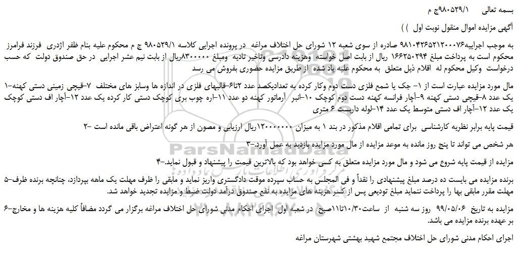 به موجب اجراییه9810426521200076 صادره از سوی شعبه 12 شورای حل اختلاف مراغه در پرونده اجرایی کلاسه 980529/1 ج م محکوم علیه بنام ظفر اژدری فرزند فرامرز محکوم است به پرداخت مبلغ 166250294 ریال از بابت اصل خواسته وهزینه دادرسی وتاخیر تادیه ومبلغ 8300000ریال از بابت نیم عشر اجرایی در حق صندوق دولت که حسب درخواست وکیل محکوم له اقلام ذیل متعلق به محکوم علیه یاد شده از طریق مزایده حضوری بفروش می رسد