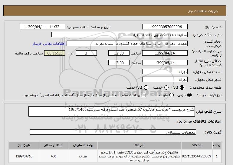 شرح کلی نیاز: شرح درپیوست *خریدسم مالاتیون 57./.ecپرداخت اسنادخزانه سررسید19/5/1400