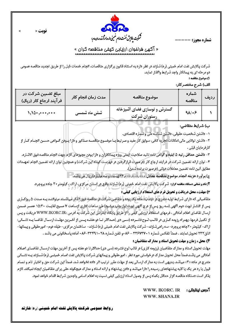 شرکت پالایش نفت امام خمینی (ره) شازند در نظر دارد به استناد قانون برگزاری مناقصات انجام خدمات ذیل را از طریق مناقصه عمومی یک مرحله ای به پیمانکار واجد شرایط واگذار نماید.