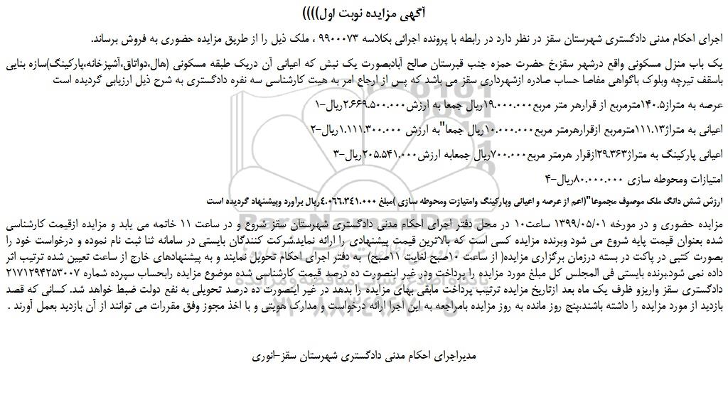 اجرای احکام مدنی دادگستری شهرستان سقز در نظر دارد در رابطه با پرونده اجرائی بکلاسه 9900073 ، ملک ذیل را از طریق مزایده حضوری به فروش برساند.