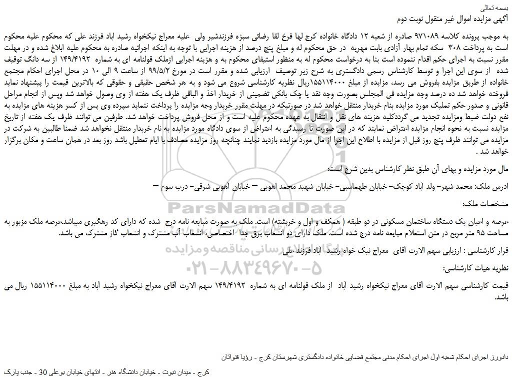 به موجب پرونده کلاسه 971089 صادره از شعبه 12 دادگاه خانواده کرج لها فرخ لقا رضائی سبزه فرزندشیر ولی علیه معراج نیکخواه رشید اباد فرزند علی که محکوم علیه محکوم است به پرداخت 308 سکه تمام بهار آزادی بابت مهریه در حق محکوم له و مبلغ پنج درصد از هزینه اجرایی با توجه به اینکه اجرائیه صادره به محکوم علیه ابلاغ شده و در مهلت مقرر نسبت به اجرای حکم اقدام ننموده است بنا به درخواست محکوم له به منظور استیفای محکوم به و هزینه اجرایی ازملک قولنامه ای به شماره 149/4192 از سه دانگ توقیف شده از سوی این اجرا و توسط کارشناس رسمی دادگستری به شرح زیر توصیف ارزیابی شده و مقرر است در مورخ 99/5/2 از ساعت 9 الی 10 در محل اجرای احکام مجتمع خانواده از طریق مزایده بفروش می رسد، مزایده از مبلغ 155114000ریال نظریه کارشناسی شروع می شود و به هر شخص حقیقی و حقوقی که بالاترین قیمت را پیشنهاد نماید فروخته خواهد شد ده درصد وجه مزایده فی المجلس بصورت وجه نقد یا چک بانکی تضمینی از خریدار اخذ و الباقی ظرف یک هفته از وی وصول خواهد شد وپس از انجام مراحل قانونی و صدور حکم تملیک مورد مزایده بنام خریدار منتقل خواهد شد در صورتیکه در مهلت مقرر خریدار وجه مزایده را پرداخت ننماید سپرده وی پس از کسر هزینه های مزایده به نفع دولت ضبط ومزایده تجدید می گرددکلیه هزینه های نقل و انتقال به عهده محکوم علیه است و از محل فروش پرداخت خواهد شد. طرفین می توانند ظرف یک هفته از تاریخ مزایده نسبت به نحوه انجام مزایده اعتراض نمایند که در این صورت تا رسیدگی به اعتراض از سوی دادگاه مورد مزایده به نام خریدار منتقل نخواهد شد ضمنا طالبین به شرکت در مزایده می توانند ظرف پنج روز قبل از مزایده با اطلاع این اجرا از مال مورد مزایده بازدید نمایند چنانچه روز مزایده مصادف با ایام تعطیل باشد روز بعد در همان ساعت و مکان برگزار خواهد شد .