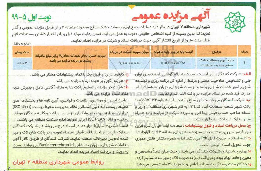 شهرداری منطقه 2 تهران در نظر دارد عملیات جمع آوری پسماند خشک سطح محدوده منطقه 2 را از طریق مزایده عمومی واگذار نماید.