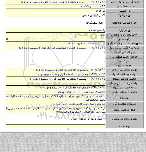 مناقصه عمومی یک مرحله ای شکاره ۰۴/۹۹ انجام سرویس ایاب و ذهاب کارکنان-بخش اتوبوسرانی
