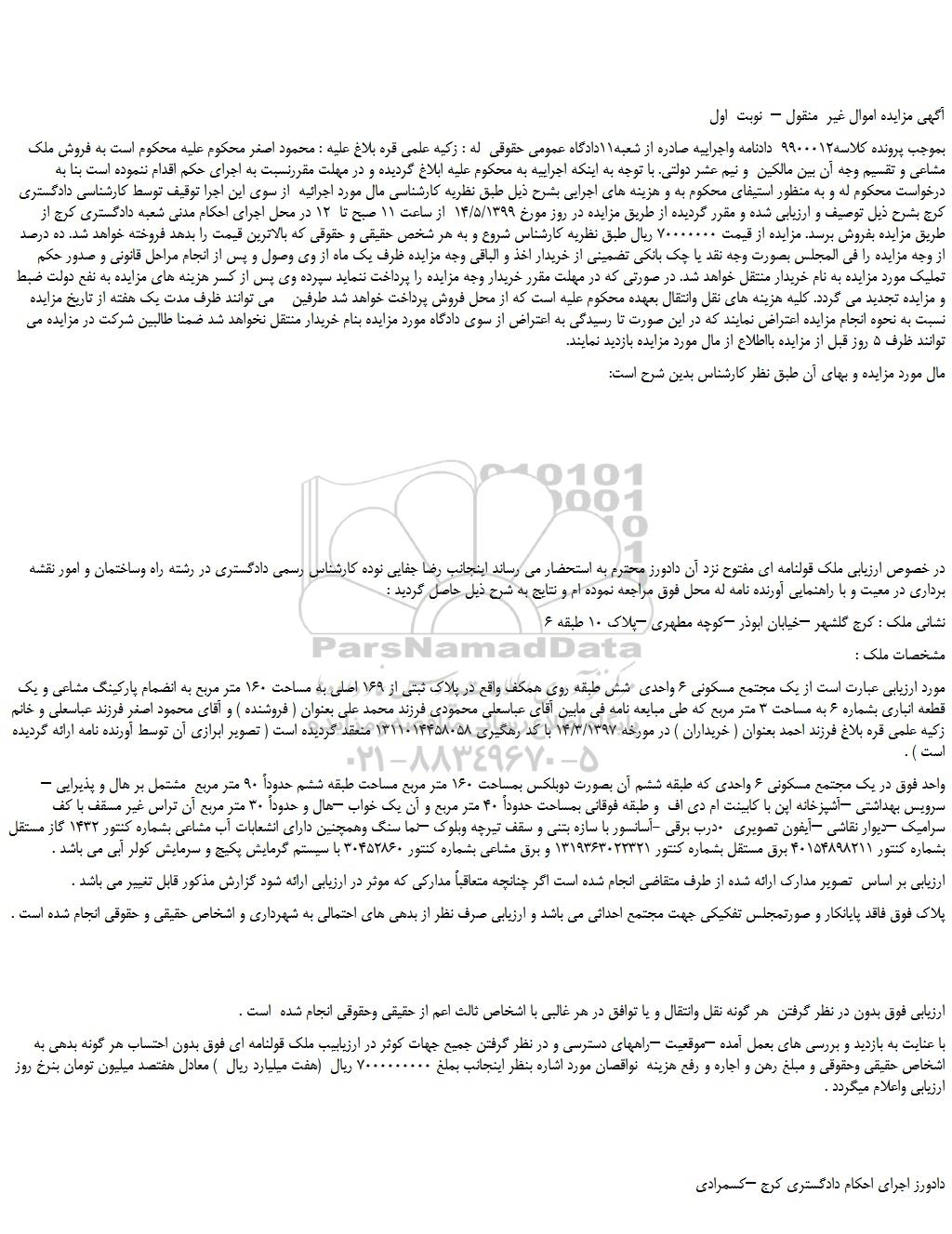 بموجب پرونده کلاسه9900012 دادنامه واجراییه صادره از شعبه11دادگاه عمومی حقوقی له : زکیه علمی قره بلاغ علیه : محمود اصغر محکوم علیه محکوم است به فروش ملک مشاعی و تقسیم وجه آن بین مالکین و نیم عشر دولتی. با توجه به اینکه اجراییه به محکوم علیه ابلاغ گردیده و در مهلت مقررنسبت به اجرای حکم اقدام ننموده است بنا به درخواست محکوم له و به منظور استیفای محکوم به و هزینه های اجرایی بشرح ذیل طبق نظریه کارشناسی مال مورد اجرائیه از سوی این اجرا توقیف توسط کارشناسی دادگستری کرج بشرح ذیل توصیف و ارزیابی شده و مقرر گردیده از طریق مزایده در روز مورخ 14/5/1399 از ساعت 11 صبح تا 12 در محل اجرای احکام مدنی شعبه دادگستری کرج از طریق مزایده بفروش برسد. مزایده از قیمت 70000000 ریال طبق نظریه کارشناس شروع و به هر شخص حقیقی و حقوقی که بالاترین قیمت را بدهد فروخته خواهد شد. ده درصد از وجه مزایده را فی المجلس بصورت وجه نقد یا چک بانکی تضمینی از خریدار اخذ و الباقی وجه مزایده ظرف یک ماه از وی وصول و پس از انجام مراحل قانونی و صدور حکم تملیک مورد مزایده به نام خریدار منتقل خواهد شد. در صورتی که در مهلت مقرر خریدار وجه مزایده را پرداخت ننماید سپرده وی پس از کسر هزینه های مزایده به نفع دولت ضبط و مزایده تجدید می گردد. کلیه هزینه های نقل وانتقال بعهده محکوم علیه است که از محل فروش پرداخت خواهد شد طرفین می توانند ظرف مدت یک هفته از تاریخ مزایده نسبت به نحوه انجام مزایده اعتراض نمایند که در این صورت تا رسیدگی به اعتراض از سوی دادگاه مورد مزایده بنام خریدار منتقل نخواهد شد ضمنا طالبین شرکت در مزایده می توانند ظرف 5 روز قبل از مزایده بااطلاع از مال مورد مزایده بازدید نمایند.