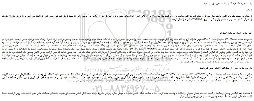 با احترام؛ به پیوست یک برگ آگهی مزایده ارسال می گردد، دستور فرمایید آگهی مزایده برای یک نوبت وفق مواد 118 و 119 قانون اجرای احکام مدنی مبنی بر درج آگهی در یکی از روزنامه های محلی و این که موعد فروش باید طوری معین شود که فاصله بین آگهی و روز فروش بیش از یک ماه و کمتر از 10 روز نباشد چاپ و منتشر و آن را قبل از تاریخ  1399/4/26به این اجرا ارسال فرمایند.