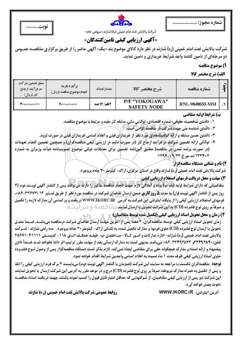 شرکت پالایش نفت امام خمینی (ره) شازند در نظر دارد کالاهای موضوع بند یک آگهی حاضر را از طریق برگزاری مناقصه عمومی دو مرحله ای از تولیدکننده/ تامین کننده واجد شرایط خریداری و تامین نماید.