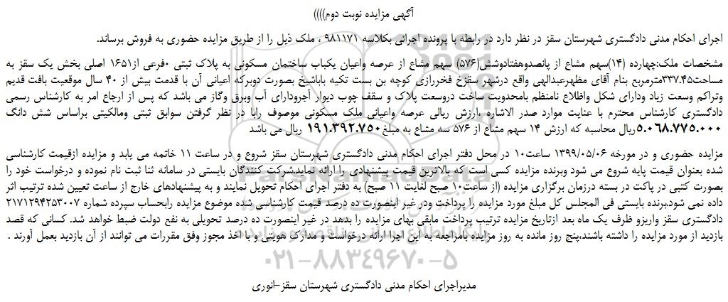 اجرای احکام مدنی دادگستری شهرستان سقز در نظر دارد در رابطه با پرونده اجرائی بکلاسه 981171 ، ملک ذیل را از طریق مزایده حضوری به فروش برساند.