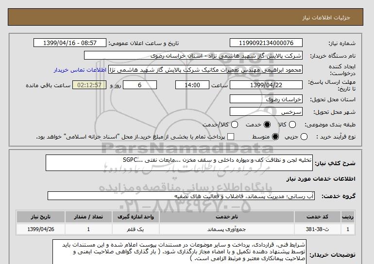 شرح کلی نیاز: تخلیه لجن و نظافت کف و دیواره داخلی و سقف مخزن ...مایعات نفتی ...SGPC