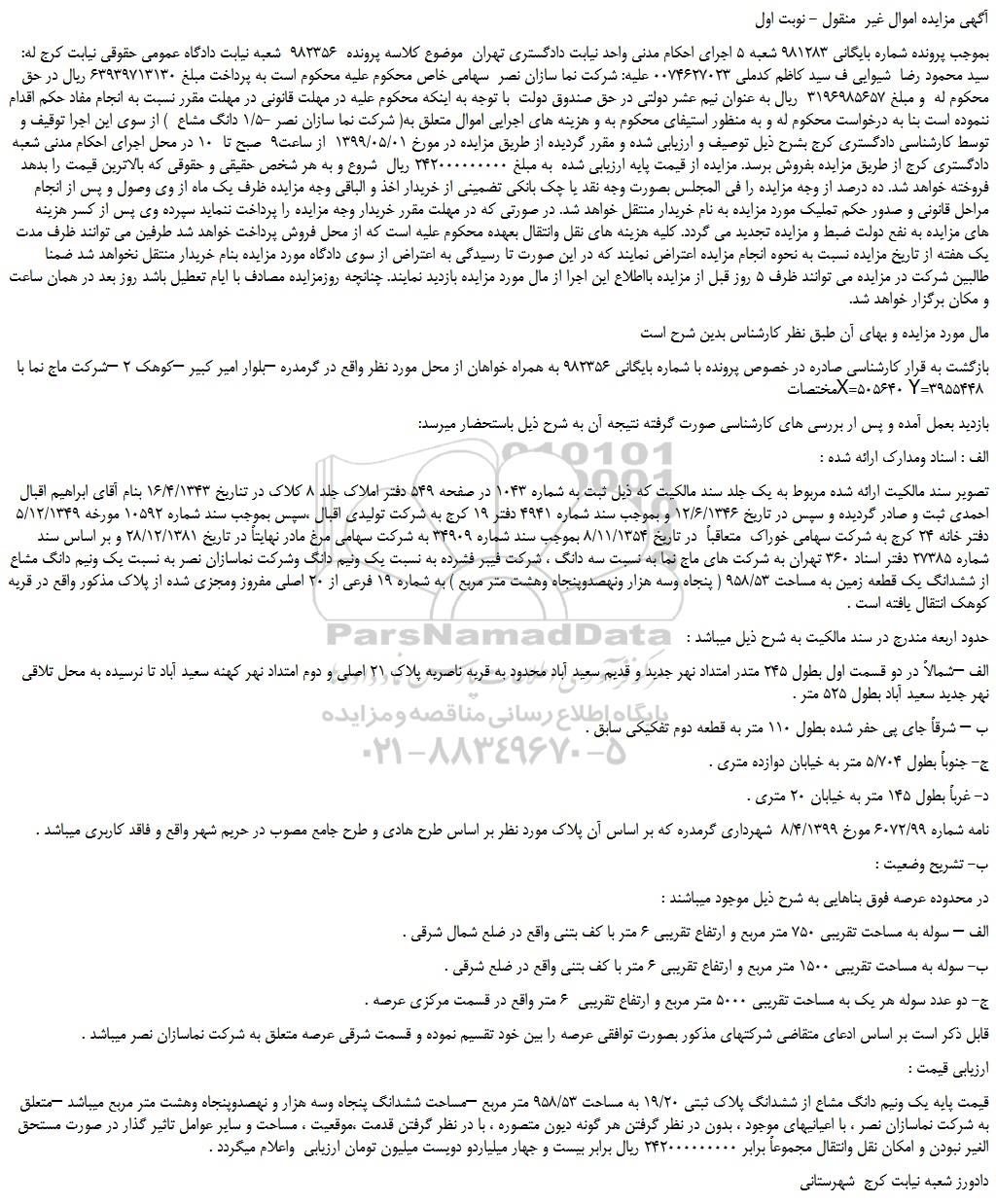 بموجب پرونده شماره بایگانی 981283 شعبه 5 اجرای احکام مدنی واحد نیابت دادگستری تهران  موضوع کلاسه پرونده  982356  شعبه نیابت دادگاه عمومی حقوقی نیابت کرج له:  سید محمود رضا  شیوایی ف سید کاظم کدملی 0074627023 علیه: شرکت نما سازان نصر  سهامی خاص محکوم علیه محکوم است به پرداخت مبلغ 63939713130 ریال در حق محکوم له  و مبلغ 3196985657  ریال به عنوان نیم عشر دولتی در حق صندوق دولت  با توجه به اینکه محکوم علیه در مهلت قانونی در مهلت مقرر نسبت به انجام مفاد حکم اقدام ننموده است بنا به درخواست محکوم له و به منظور استیفای محکوم به و هزینه های اجرایی اموال متعلق به( شرکت نما سازان نصر -1/5 دانگ مشاع  ) از سوی این اجرا توقیف و توسط کارشناسی دادگستری کرج بشرح ذیل توصیف و ارزیابی شده و مقرر گردیده از طریق مزایده در مورخ 1399/05/01  از ساعت9  صبح تا  10 در محل اجرای احکام مدنی شعبه دادگستری کرج از طریق مزایده بفروش برسد. مزایده از قیمت پایه ارزیابی شده  به مبلغ 242000000000 ریال  شروع و به هر شخص حقیقی و حقوقی که بالاترین قیمت را بدهد فروخته خواهد شد. ده درصد از وجه مزایده را فی المجلس بصورت وجه نقد یا چک بانکی تضمینی از خریدار اخذ و الباقی وجه مزایده ظرف یک ماه از وی وصول و پس از انجام مراحل قانونی و صدور حکم تملیک مورد مزایده به نام خریدار منتقل خواهد شد. در صورتی که در مهلت مقرر خریدار وجه مزایده را پرداخت ننماید سپرده وی پس از کسر هزینه های مزایده به نفع دولت ضبط و مزایده تجدید می گردد. کلیه هزینه های نقل وانتقال بعهده محکوم علیه است که از محل فروش پرداخت خواهد شد طرفین می توانند ظرف مدت یک هفته از تاریخ مزایده نسبت به نحوه انجام مزایده اعتراض نمایند که در این صورت تا رسیدگی به اعتراض از سوی دادگاه مورد مزایده بنام خریدار منتقل نخواهد شد ضمنا طالبین شرکت در مزایده می توانند ظرف 5 روز قبل از مزایده بااطلاع این اجرا از مال مورد مزایده بازدید نمایند. چنانچه روزمزایده مصادف با ایام تعطیل باشد روز بعد در همان ساعت و مکان برگزار خواهد شد.