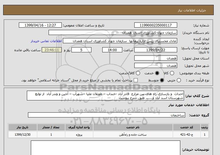 شرح کلی نیاز: احداث و بازسازی راه های بین مزارع قادر آباد -خنداب – طویلان علیا –شهرآب – آجین و وندر آباد از توابع شهرستان اسد آباد و...... طبق شرح پیوست