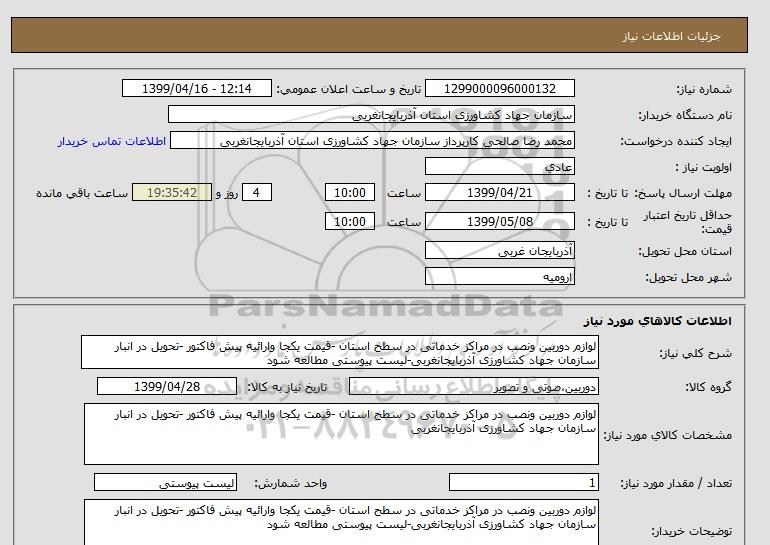 شرح کلی نیاز: لوازم دوربین ونصب در مراکز خدماتی در سطح استان -قیمت یکجا وارائیه پیش فاکتور -تحویل در انبار سازمان جهاد کشاورزی آذربایجانغربی-لیست پیوستی مطالعه شود