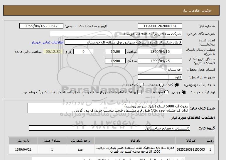 شرح کلی نیاز: مخزن آب 5000 لیتری (طبق شرایط پیوست) ایران کد مشابه بوده وکالا طبق فرم پیشنهاد قیمت پیوست خریداری می گردد .