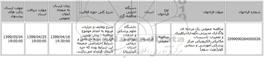 | 2099090264000026 | مناقصه عمومی یک مرحله ای واگذاری مدیریتی،نگهداری،راهبری و تعمیرات تاسیسات مکانیکی،الکترونیکی مرکز پزشکی،آموزشی و درمانی کوثر(نوبت سوم) | مناقصه عمومی | کردستان | دانشگاه علوم پزشکی و خدمات بهداشتی، درمانی استان کردستان | شرح وظایف و جزئیات مربوط به انجام موضوع مناقصه : پیش نویس قرارداد، بسته خدماتی و شرایط اختصاصی ضمیمه این شرایط بوده که جزء لاینفک قرارداد می باشد. | 1399/04/16 14:30:00 | 1399/04/25 19:00:00 | 1399/05/04 19:00:00 |