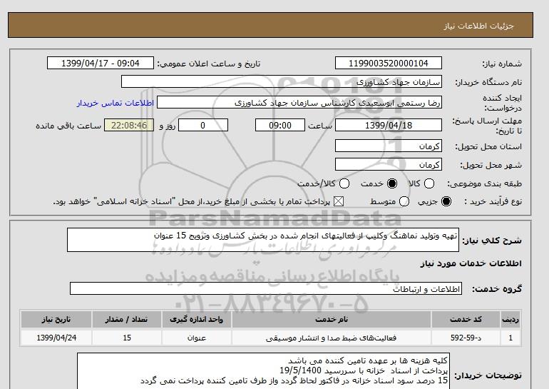 شرح کلی نیاز: تهیه وتولید نماهنگ وکلیپ از فعالیتهای انجام شده در بخش کشاورزی وترویج 15 عنوان