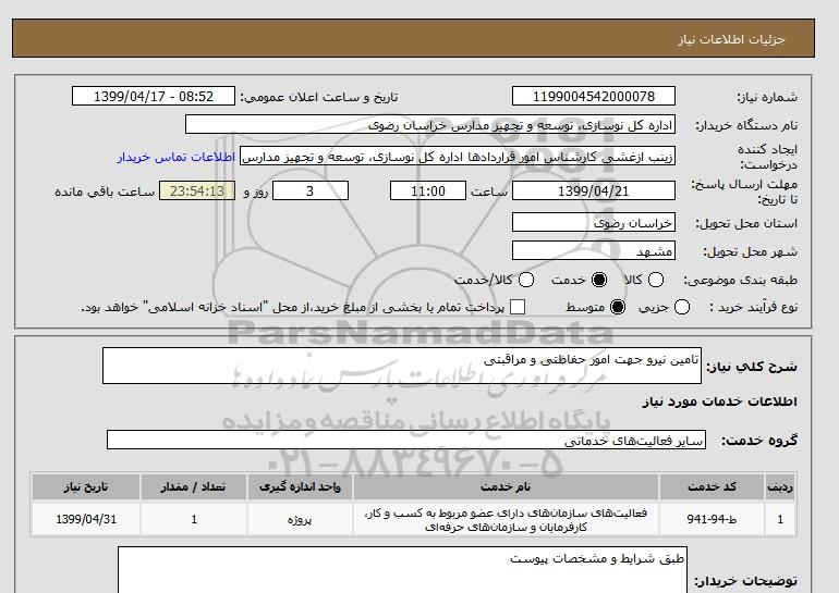 شرح کلی نیاز: تامین نیرو جهت امور حفاظتی و مراقبتی