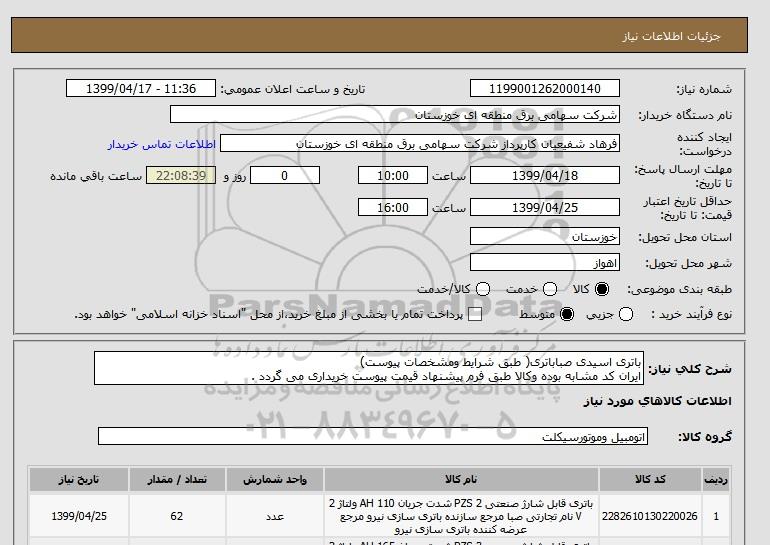 استعلام باتری اسیدی صباباتری( طبق شرایط ومشخصات پیوست) ایران کد مشابه بوده وکالا طبق فرم پیشنهاد قیمت پیوست خریداری می گردد ., استعلام باتری اسیدی صباباتری( طبق شرایط ومشخصات پیوست) ایران کد مشابه بوده وکالا طبق فرم پیشنهاد قیمت پیوست خریداری می گردد .