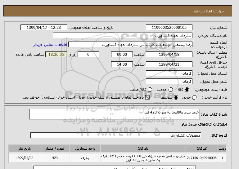 شرح کلی نیاز: خرید سم مالاتیون به میزان 420 لیتر