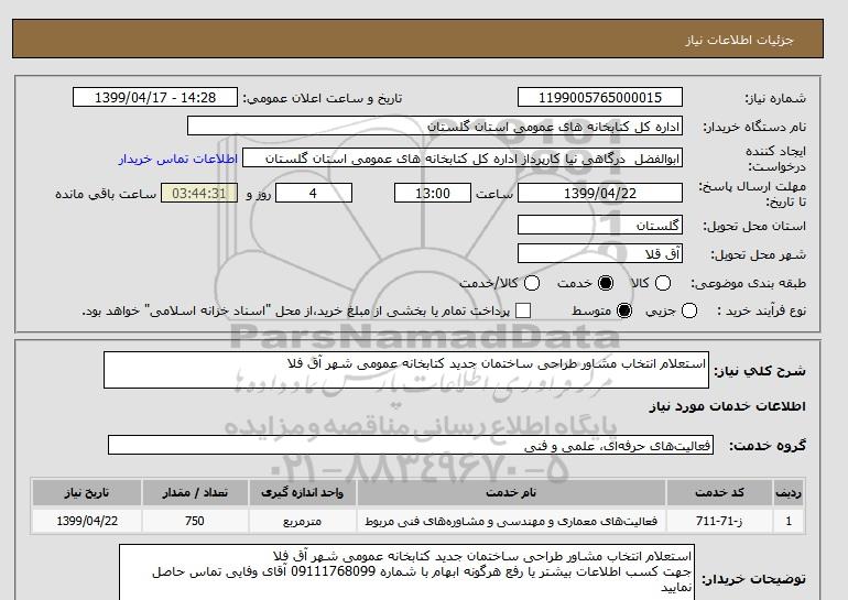 شرح کلی نیاز: استعلام انتخاب مشاور طراحی ساختمان جدید کتابخانه عمومی شهر آق فلا