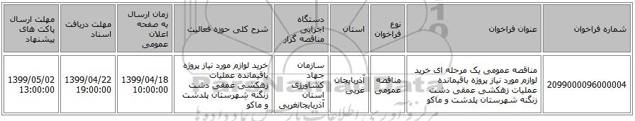 2099000096000004مناقصه عمومی یک مرحله ای خرید لوازم مورد نیاز پروژه باقیمانده عملیات زهکشی عمقی دشت زنگنه شهرستان پلدشت و ماکومناقصه عمومیآذربایجان غربیسازمان جهاد کشاورزی استان آذربایجانغربیخرید لوازم مورد نیاز پروژه باقیمانده عملیات زهکشی عمقی دشت زنگنه شهرستان پلدشت و ماکو1399/04/18 10:00:001399/04/22 19:00:001399/05/02 13:00:00