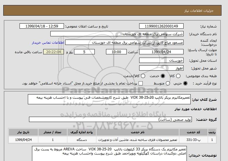 استعلام تعمیرمکانیزم بریکر باتایپ VOX 38-25-20 طبق شرح کارومشخصات فنی پیوست و با احتساب هزینه بیمه , استعلام تعمیرمکانیزم بریکر باتایپ VOX 38-25-20 طبق شرح کارومشخصات فنی پیوست و با احتساب هزینه بیمه