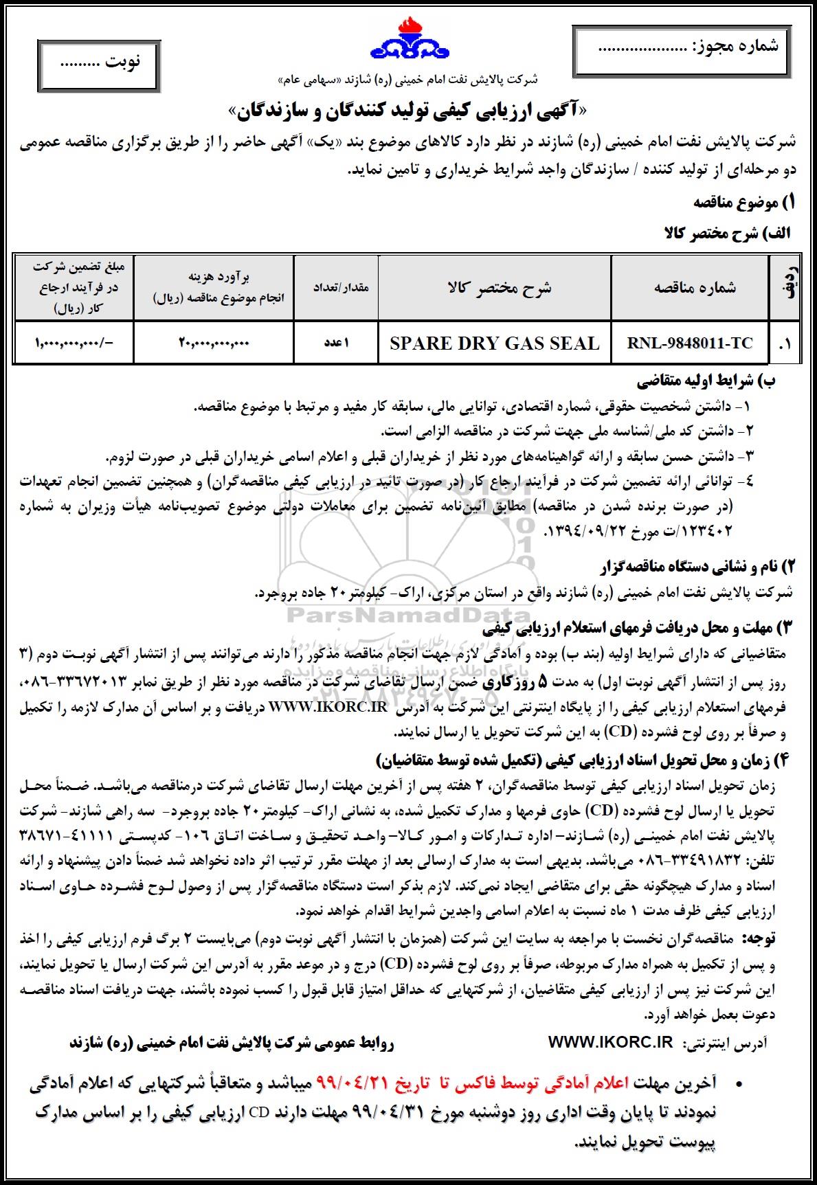 مناقصه SPARE DRY GAS SEAL از کلیه افراد متخصص و شرکتها واجد شرایط دعوت به عمل میآید در مناقصه با کد خبرگزاری پارس نماد: 2526695 شرکت نمایند.