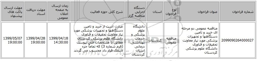 مناقصه، مناقصه عمومی دو مرحله ای خرید و تامین دستگاهها و تجهیزات پزشکی مورد نیاز معاونت تحقیقات و فناوری دانشگاه علوم پزشکی کردستان از کلیه افراد متخصص و شرکت‌ها واجد شرایط دعوت به عمل می‌آید در مناقصه با کد خبرگزاری پارس نماد: 2526751 شرکت نمایند. این مناقصه در تاریخ 1399/04/18 شروع و مهلت آن تا تاریخ 1399/04/28 میباشد.