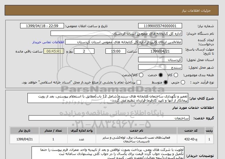 شرح کلی نیاز: تعمیر و نگهداری ساختمان کتابخانه های سنندج(شامل 12 باب)مطابق با استعلام پیوستی، بعد از رویت پیمانکار از آنها و تایید کارفرما قرارداد تنظیم می گردد.