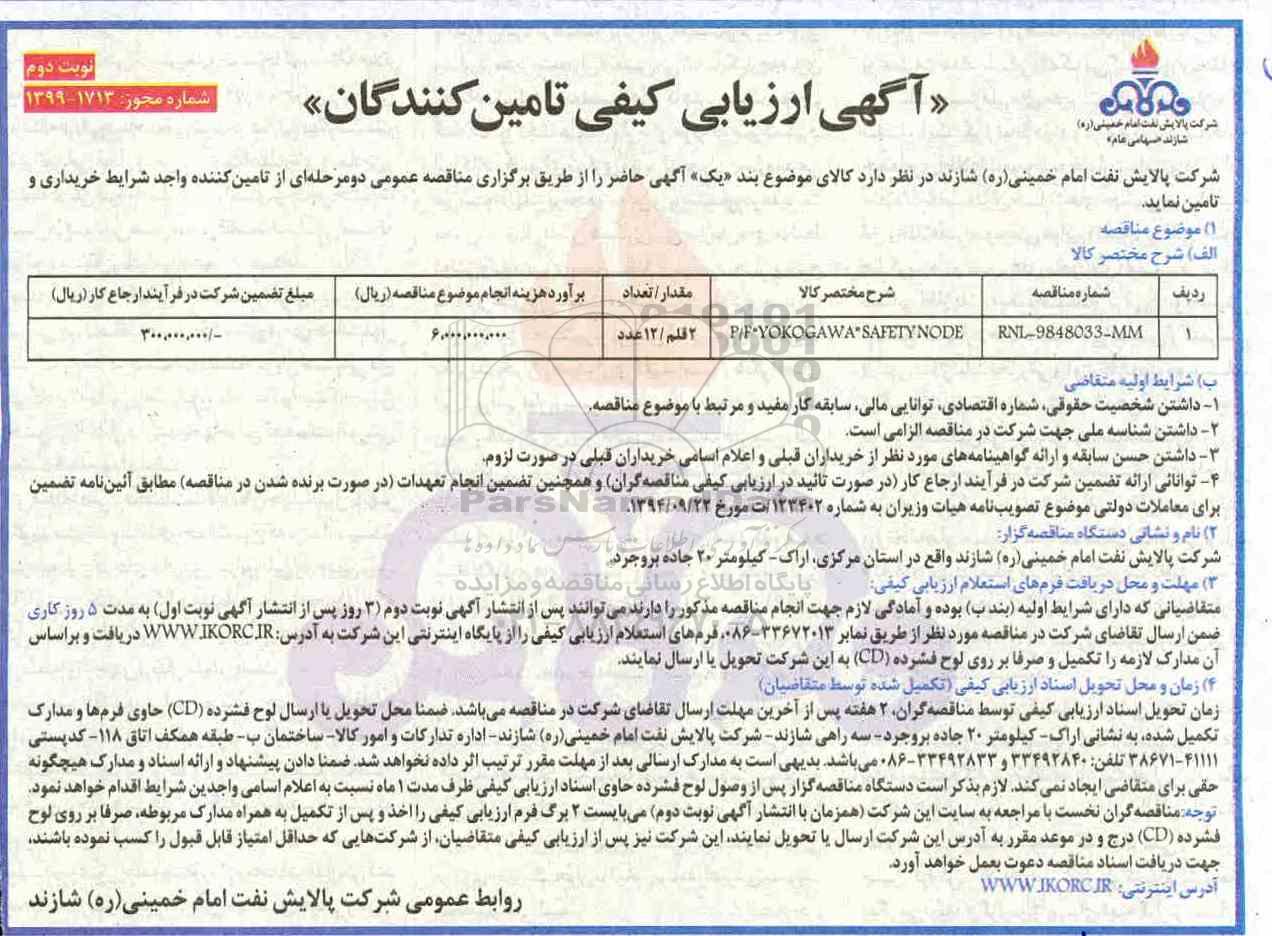 ارزیابی کیفی تامین کنندگان P/F YOKOGAWA SAFETY NODE- نوبت دوم از کلیه افراد متخصص و شرکتها واجد شرایط دعوت به عمل میآید در مناقصه با کد خبرگزاری پارس نماد: 2527835 شرکت نمایند.