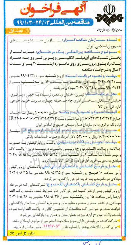 - موضوع مناقصه بین المللی یک مرحله ای: عبارت است از پخش شبکه های آی فیلم انگلیسی و پرس تی وی به همراه یک رادیوی برون مرزی روی ماهواره اینتلست 20 برای مدت 3 سال به شرح اسناد مناقصه