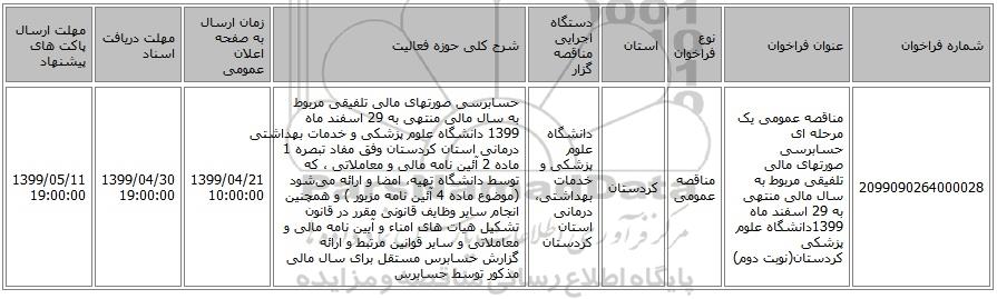 | 2099090264000028 | مناقصه عمومی یک مرحله ای حسابرسی صورتهای مالی تلفیقی مربوط به سال مالی منتهی به 29 اسفند ماه 1399دانشگاه علوم پزشکی کردستان(نوبت دوم) | مناقصه عمومی | کردستان | دانشگاه علوم پزشکی و خدمات بهداشتی، درمانی استان کردستان | حسابرسی صورتهای مالی تلفیقی مربوط به سال مالی منتهی به 29 اسفند ماه 1399 دانشگاه علوم پزشکی و خدمات بهداشتی درمانی استان کردستان وفق مفاد تبصره 1 ماده 2 آئین نامه مالی و معاملاتی ، که توسط دانشگاه تهیه، امضا و ارائه میشود (موضوع ماده 4 آئین نامه مزبور ) و همچنین انجام سایر وظایف قانونی مقرر در قانون تشکیل هیات های امناء و آیین نامه مالی و معاملاتی و سایر قوانین مرتبط و ارائه گزارش حسابرس مستقل برای سال مالی مذکور توسط حسابرس | 1399/04/21 10:00:00 | 1399/04/30 19:00:00 | 1399/05/11 19:00:00 |