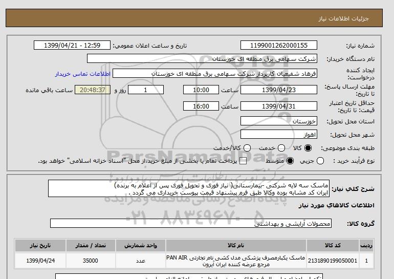 شرح کلی نیاز: ماسک سه لایه شرکتی -بیمارستانی( نیاز فوری و تحویل فوری پس از اعلام به برنده) ایران کد مشابه بوده وکالا طبق فرم پیشنهاد قیمت پیوست خریداری می گردد .