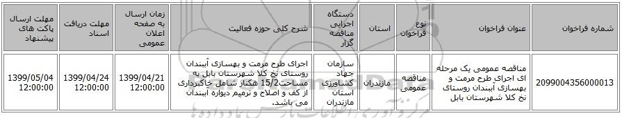 | 2099004356000013 | مناقصه عمومی یک مرحله ای اجرای طرح مرمت و بهسازی آببندان روستای نخ کلا شهرستان بابل | مناقصه عمومی | مازندران | سازمان جهاد کشاورزی استان مازندران | اجرای طرح مرمت و بهسازی آببندان روستای نخ کلا شهرستان بابل به مساحت15/2 هکتار شامل خاکبرداری از کف و اصلاح و ترمیم دیواره آببندان می باشد. | 1399/04/21 12:00:00 | 1399/04/24 12:00:00 | 1399/05/04 12:00:00 |