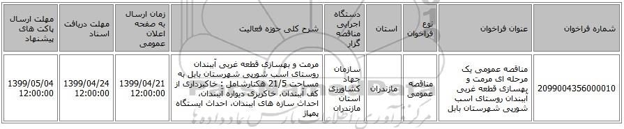| 2099004356000010 | مناقصه عمومی یک مرحله ای مرمت و بهسازی قطعه غربی آببندان روستای اسب شورپی شهرستان بابل | مناقصه عمومی | مازندران | سازمان جهاد کشاورزی استان مازندران | مرمت و بهسازی قطعه غربی آببندان روستای اسب شورپی شهرستان بابل به مساحت 21/5 هکتارشامل : خاکبرداری از کف آببندان، خاکریزی دیواره آببندان، احداث سازه های آببندان، احداث ایستگاه پمپاژ | 1399/04/21 12:00:00 | 1399/04/24 12:00:00 | 1399/05/04 12:00:00 |