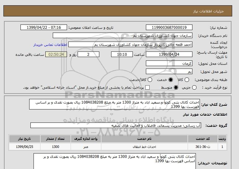 شرح کلی نیاز: احداث کانال بتنی کوتوآ و سعید اباد به متراژ 1300 متر به مبلغ 1084038208 ریال بصورت نقدی و بر اساس فهرست بها 1399