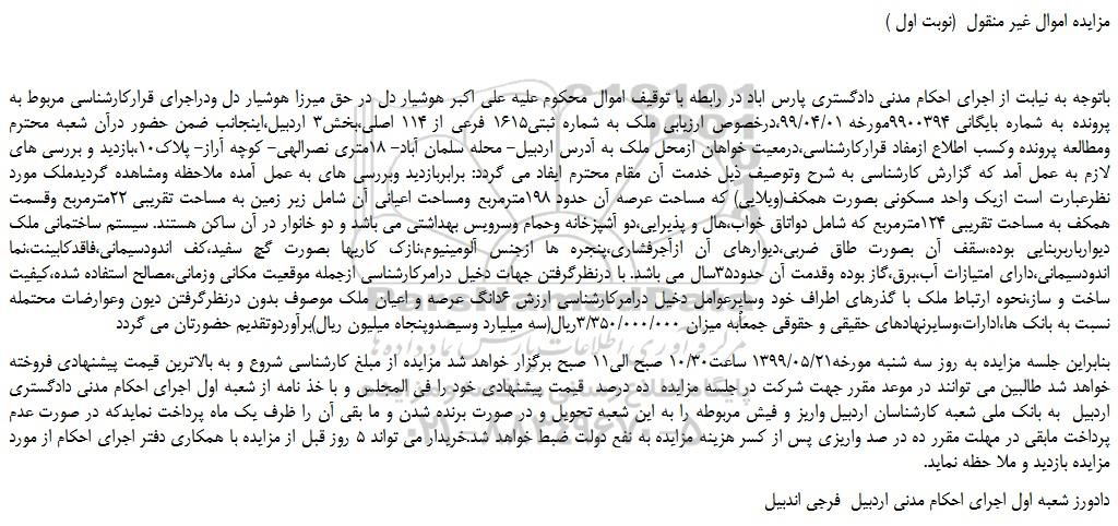 بنابراین جلسه مزایده به روز سه شنبه مورخه1399/05/21 ساعت10/30 صبح الی11 صبح برگزار خواهد شد مزایده از مبلغ کارشناسی شروع و به بالاترین قیمت پیشنهادی فروخته خواهد شد طالبین می توانند در موعد مقرر جهت شرکت در جلسه مزایده ده درصد قیمت پیشنهادی خود را فی المجلس و با خذ نامه از شعبه اول اجرای احکام مدنی دادگستری اردبیل به بانک ملی شعبه کارشناسان اردبیل واریز و فیش مربوطه را به این شعبه تحویل و در صورت برنده شدن و ما بقی آن را ظرف یک ماه پرداخت نمایدکه در صورت عدم پرداخت مابقی در مهلت مقرر ده در صد واریزی پس از کسر هزینه مزایده به نفع دولت ضبط خواهد شد.خریدار می تواند 5 روز قبل از مزایده با همکاری دفتر اجرای احکام از مورد مزایده بازدید و ملا حظه نماید.