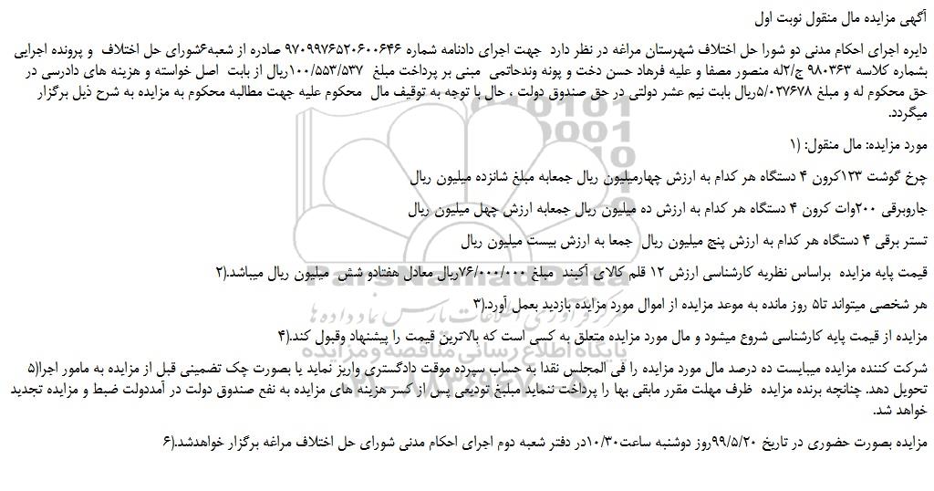6)مزایده بصورت حضوری در تاریخ 99/5/20روز دوشنبه ساعت10/30در دفتر شعبه دوم اجرای احکام مدنی شورای حل اختلاف مراغه برگزار خواهدشد.