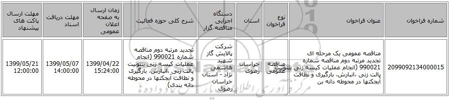 | 2099092134000015 | مناقصه عمومی یک مرحله ای تجدید مرتبه دوم مناقصه شماره 990021 (انجام عملیات کیسه زنی بنتونیت پالت زنی ،انبارش، بارگیری و نظافت آبجکتها در محوطه دانه بن | مناقصه عمومی | خراسان رضوی | شرکت پالایش گاز شهید هاشمی نژاد - استان خراسان رضوی | تجدید مرتبه دوم مناقصه شماره 990021 (انجام عملیات کیسه زنی بنتونیت پالت زنی ،انبارش، بارگیری و نظافت آبجکتها در محوطه دانه بندی) | 1399/04/22 15:24:00 | 1399/05/07 14:00:00 | 1399/05/21 12:00:00 |