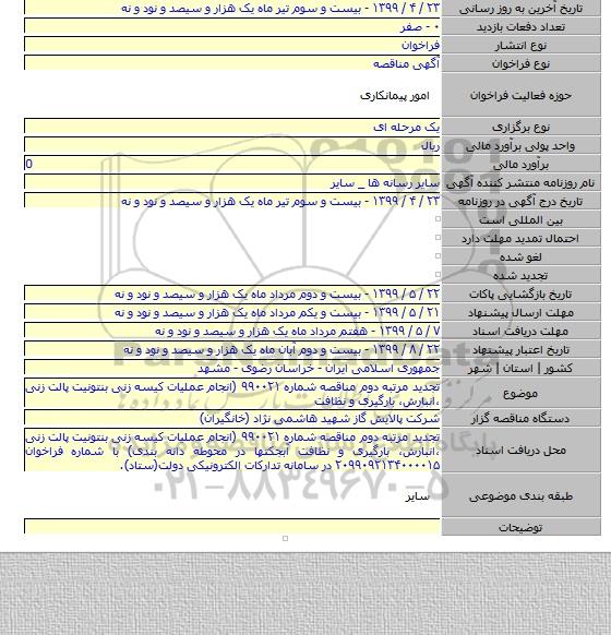تجدید مرتبه دوم مناقصه شماره ۹۹۰۰۲۱ (انجام عملیات کیسه زنی بنتونیت پالت زنی ،انبارش، بارگیری و نظافت