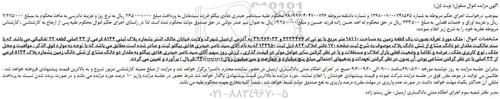 بنابراین جلسه مزایده به روز دوشنبه مورخه 99/05/20ساعت 09:00الی 09:3009:30صبح در اجرای احکام مدنی دادگستری اردبیل در حضور نماینده محترم دادسرا برگزار خواهد شد و مزایده از مبلغ معینه کارشناسی مزبور شروع و به بالاترین قیمت پیشنهادی فروخته خواهد شد . طالبین می توانند در موعد مقرر فوق در جلسه مزایده شرکت نموده و قیمت پیشنهادی خودشان را اعلام نمایند . مورد مزایده به بالاترین قیمت پیشنهادی واگذار خواهد شد شرط حضور در جلسه مزایده واریز 10 درصد مورد مزایده می باشد و در صورت برنده شدن نسبت به پرداخت مابقی آن حداکثر یکماه مهلت خواهد داشت در صورت عدم واریزی در مهلت مقرره درصد واریزی به نفع صندوق دولت ضبط خواهد شد . ضمناً کلیه مخارج بعهده محکوم علیه می باشد.