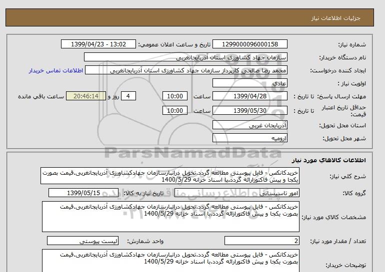 مشخصات کالای مورد نیاز: خریدکانکس - فایل پیوستی مطالعه گردد.تحویل درانبارسازمان جهادکشاورزی آذربایجانغربی.قیمت بصورت یکجا و پیش فاکتورارائه گردد.با اسناد خزانه 1400/5/29