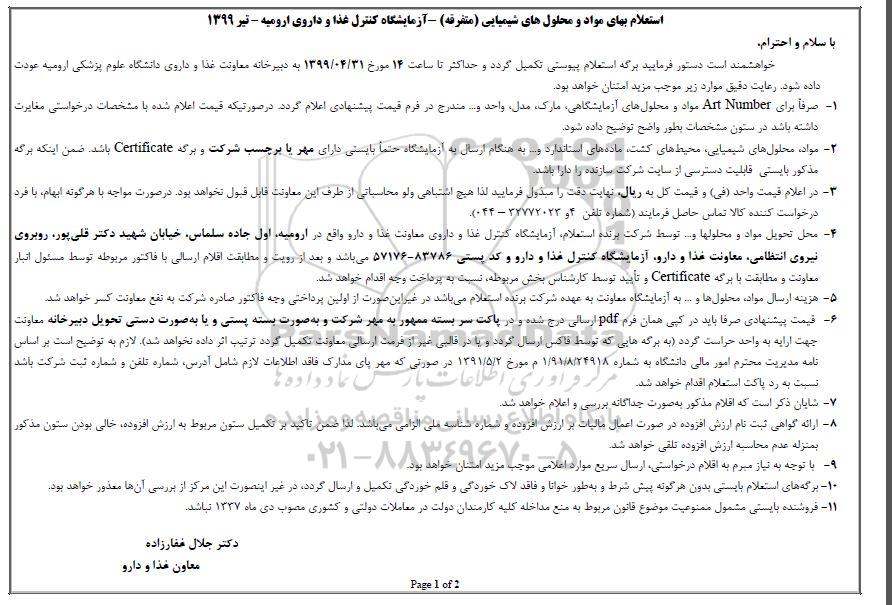 استعلام بهای قیمت مواد و محلول های شیمیایی - آزمایشگاه کنترل غذا و داروی ارومیه تیر 99 ؟